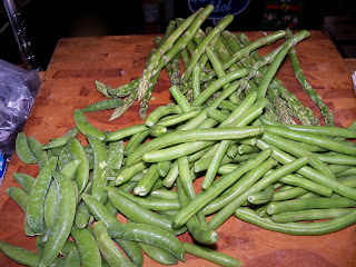 Here we have snow peas, asparagus and green beans. Trim the beans and cut the tough ends from the asparagus. Now my trick for making veggies extra delicious: A brief bath in hot water.