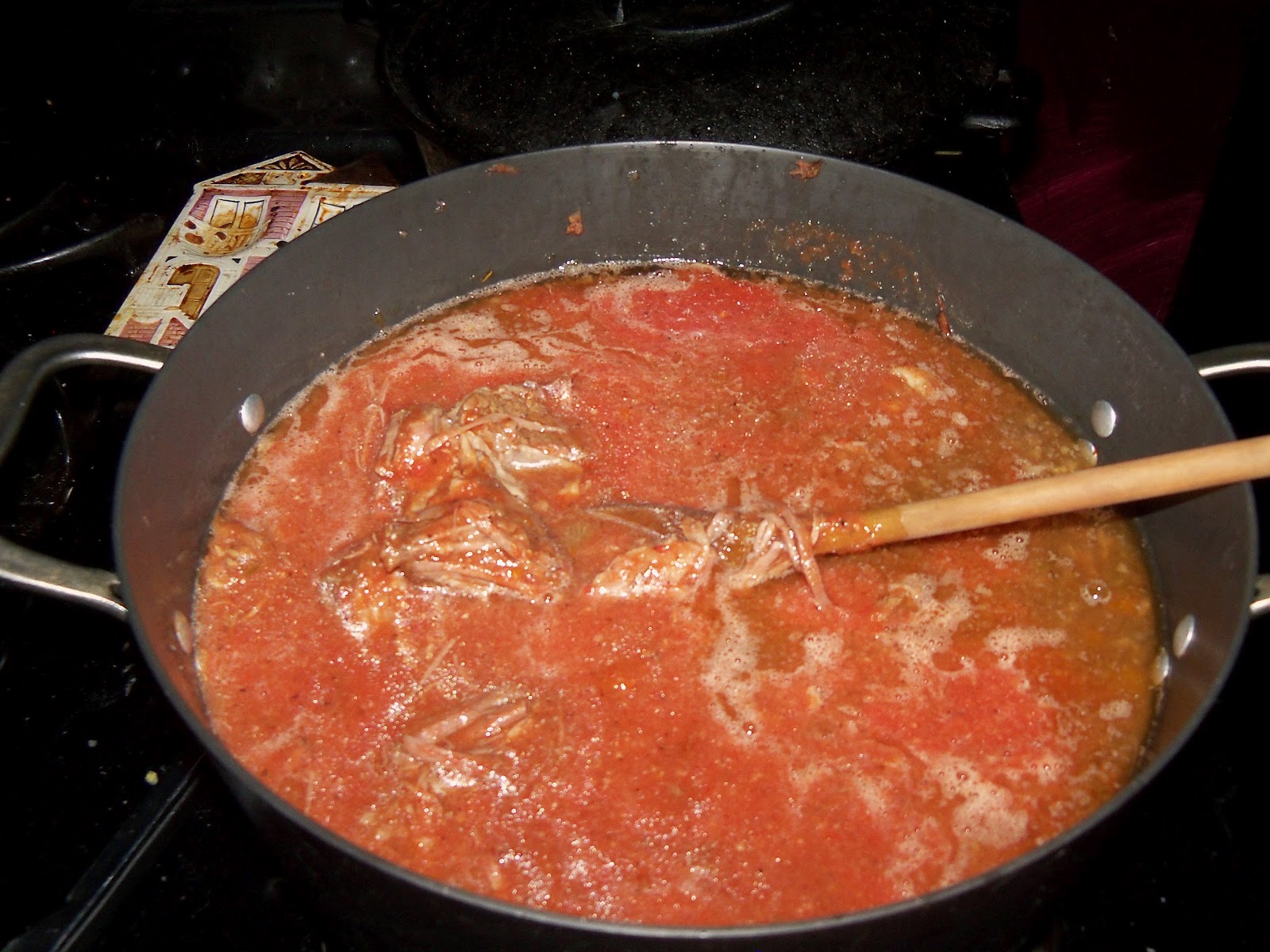 Once that meat is tender, you'll pull it out and shred it. Then put it in a cast iron or some other kind of heavy duty metal pot that can take a bit of beating with a spoon without damaging the finish. Put the cooking liquid on top of it. (make sure you fish out that sprig of Thyme.)